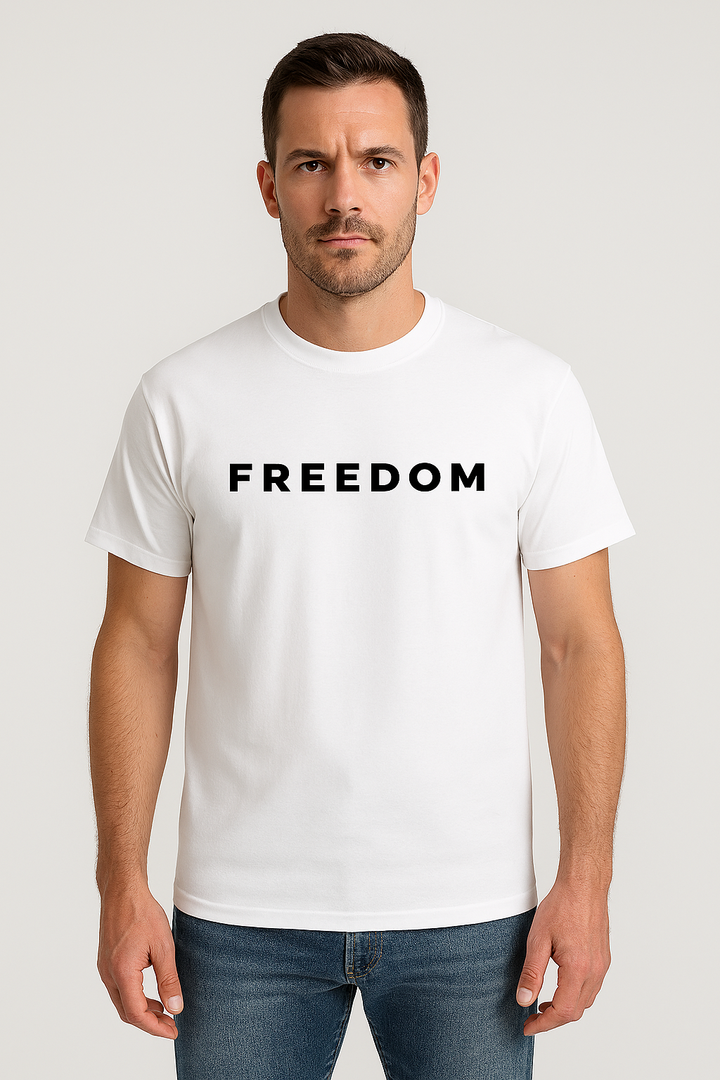 “FREEDOM” stands front and center in bold black capital letters—clean, unapologetic, and universally resonant. The design’s simplicity is its strength, allowing the message to speak louder than any graphic. Whether worn as a personal declaration, a political stance, or a tribute to individual liberty, this shirt pairs effortlessly with any look while keeping its purpose clear. Made for those who value clarity, conviction, and timeless style, it’s more than just apparel—it’s a message you wear.