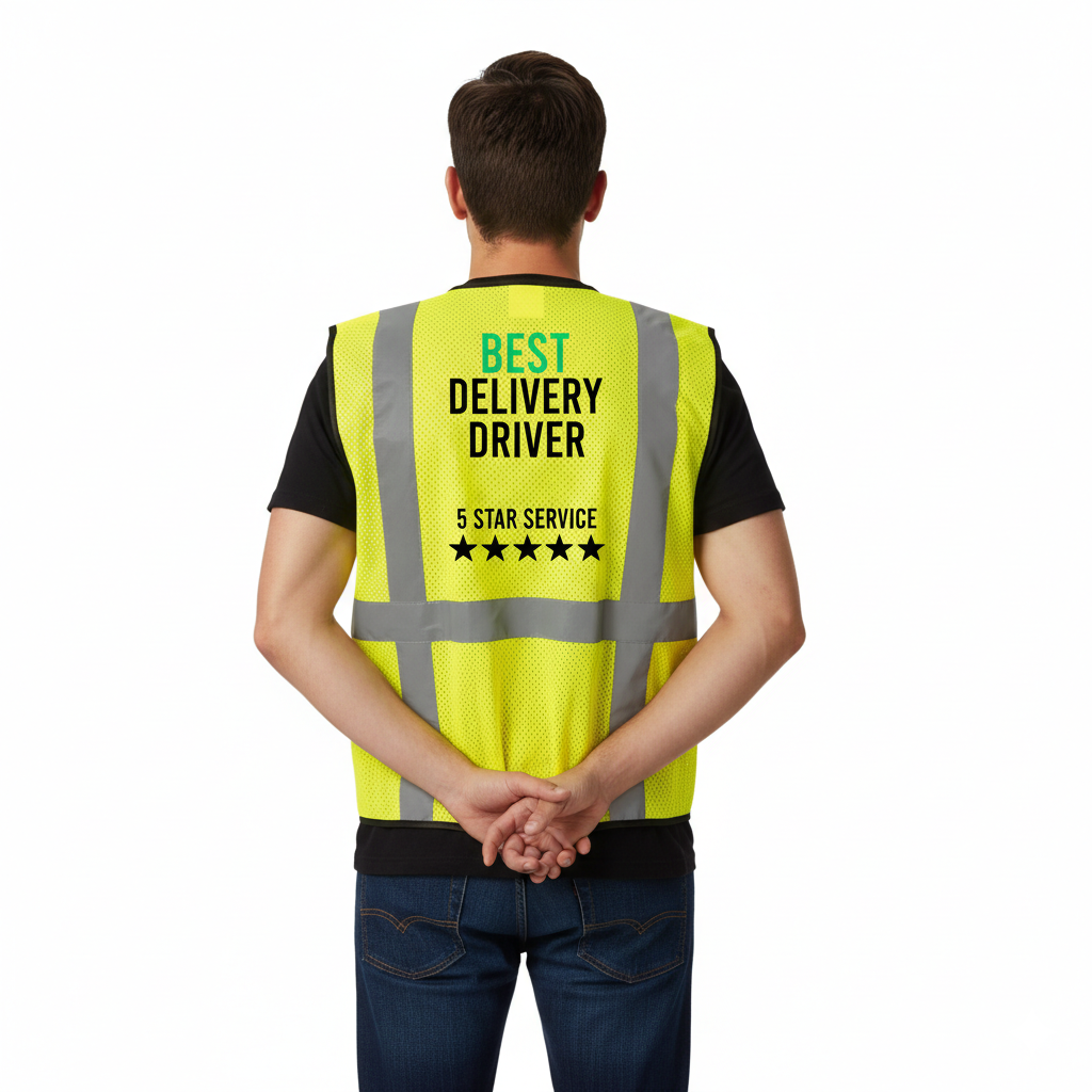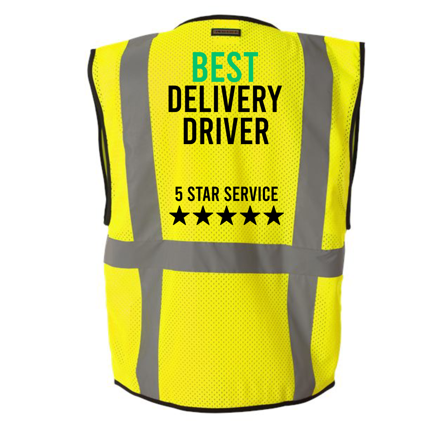 Stand out on the road with the “Best Delivery Driver” high-visibility vest — designed for those who take pride in every drop-off. This bright yellow safety vest features bold black lettering and reflective gray stripes for maximum visibility during day or night deliveries. The standout “5 STAR SERVICE” and five-star graphic on the back send a clear message: you’re committed to excellence. Whether you're navigating busy streets or making doorstep handoffs, this vest adds a layer of professionalism and recognition to your hustle. Lightweight, breathable, and built for comfort, it’s the perfect gear for drivers who go above and beyond.