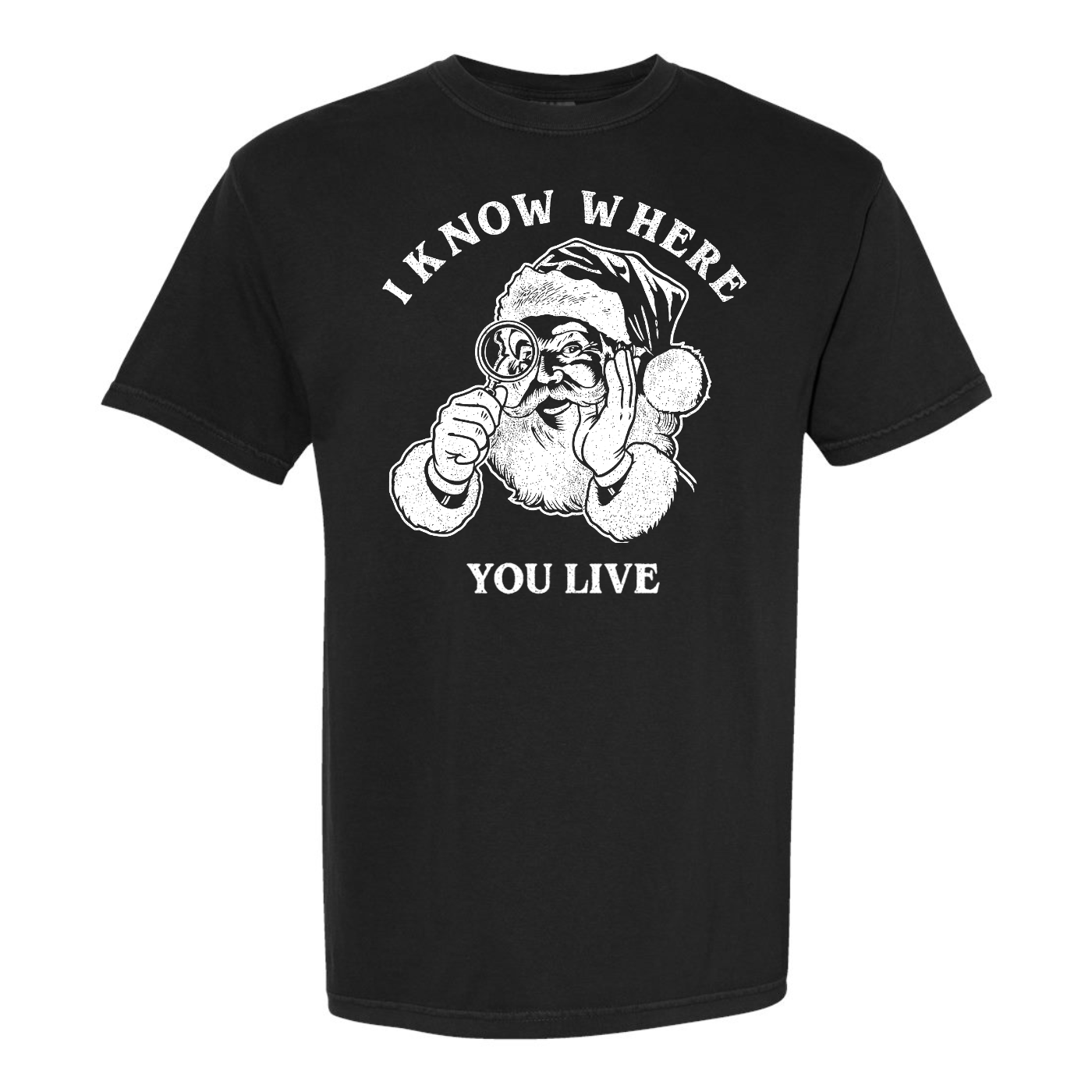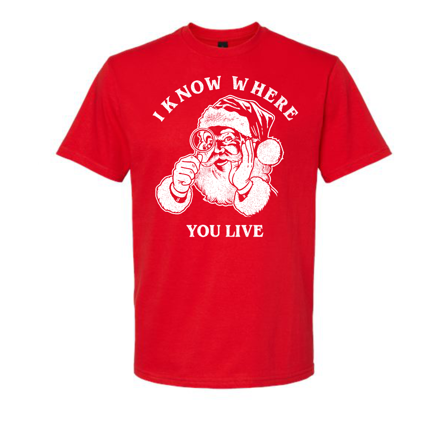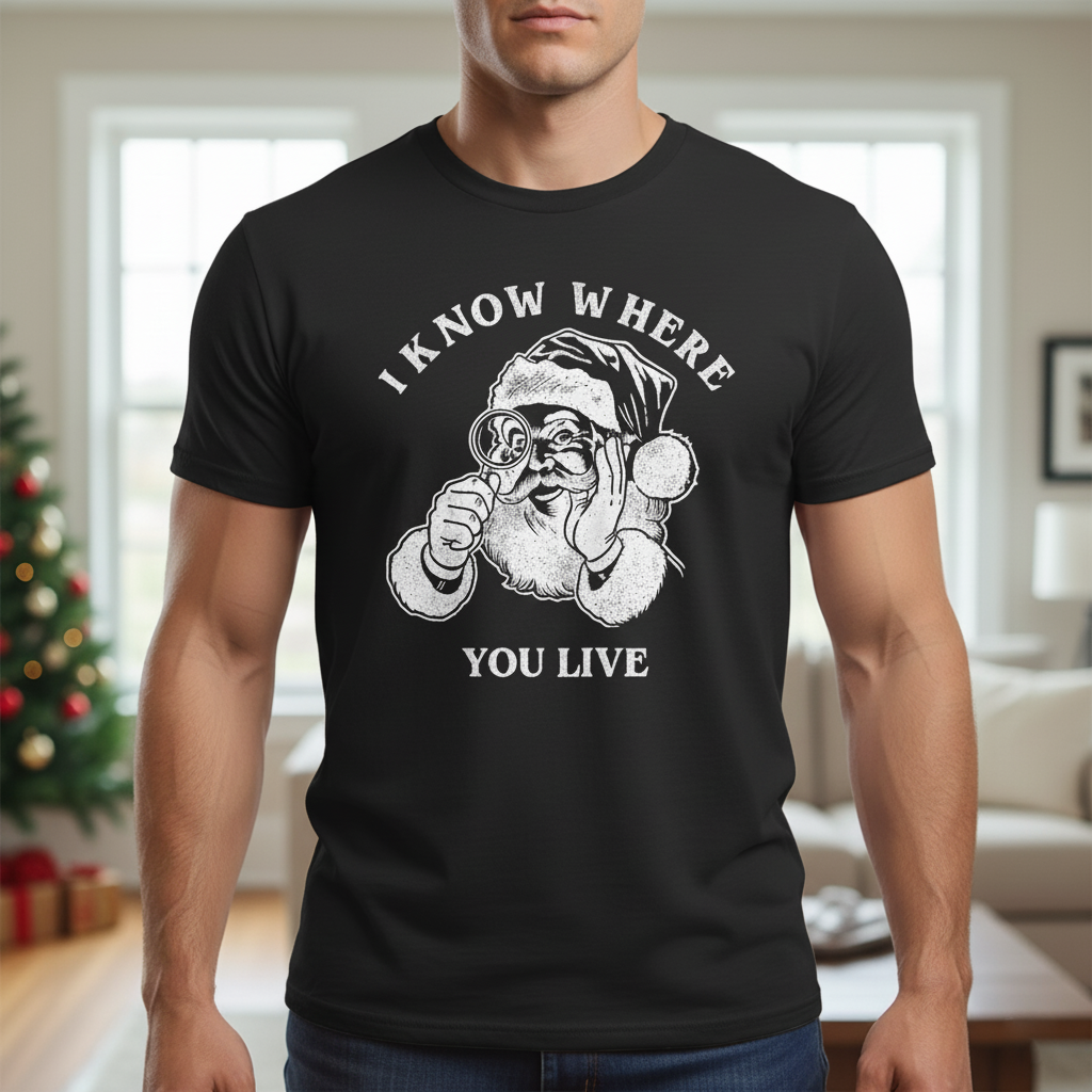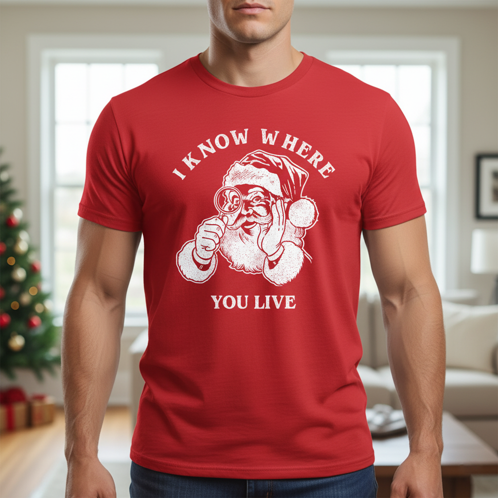 Make spirits bright—and slightly suspicious—with this hilariously bold “I Know Where You Live” Santa tee. Featuring a cartoon-style Saint Nick peering through a monocular, this design flips the jolly holiday vibe into something a little more cheeky. Printed in crisp white on a vibrant red shirt, the graphic is framed by cozy Christmas elements like a decorated tree and living room backdrop, adding contrast to the playfully ominous message. Whether you’re gifting it to the prankster in your life or wearing it to your next ugly sweater party with ironic flair, this shirt delivers festive fun with a wink and a side of mischief. Santa sees you when you're sleeping—and now he’s watching your street.