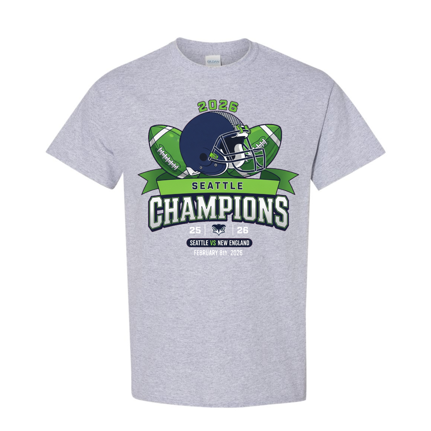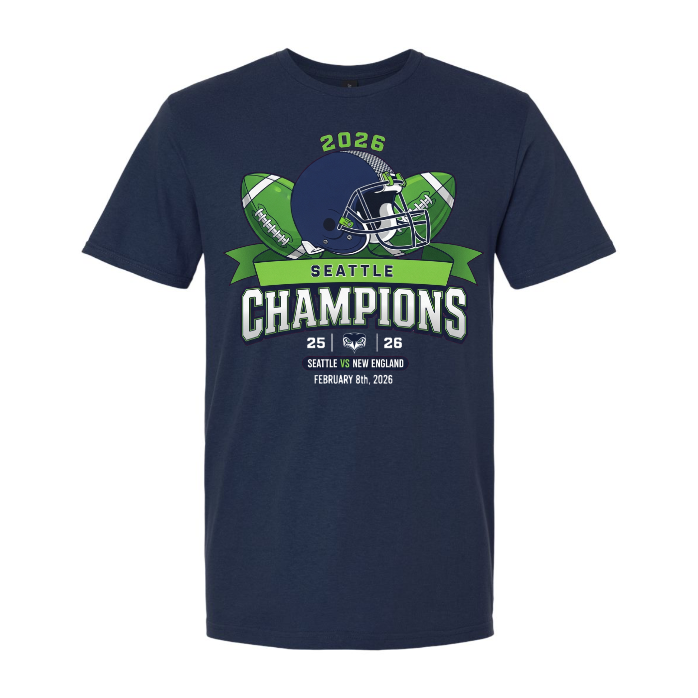 Honor Seattle’s thrilling 2026 championship win with this bold and dynamic commemorative tee. Set against a rich navy canvas, the design centers around a sleek football helmet flanked by two vibrant green footballs. Above the helmet, “2026” stands tall in collegiate-style lettering, while below, a green ribbon proudly displays “SEATTLE.” The word “CHAMPIONS” bursts forth in large white and green text, capturing the energy of victory. Beneath it, the score “25 26” is split by a stylized bird emblem, symbolizing the fierce competition. The bottom of the design features the matchup “SEATTLE VS NEW ENGLAND” and the date “FEBRUARY 8TH, 2026,” marking the moment of triumph. Perfect for fans who want to celebrate Seattle’s edge-of-your-seat win in style, this shirt blends high-impact visuals with championship pride.