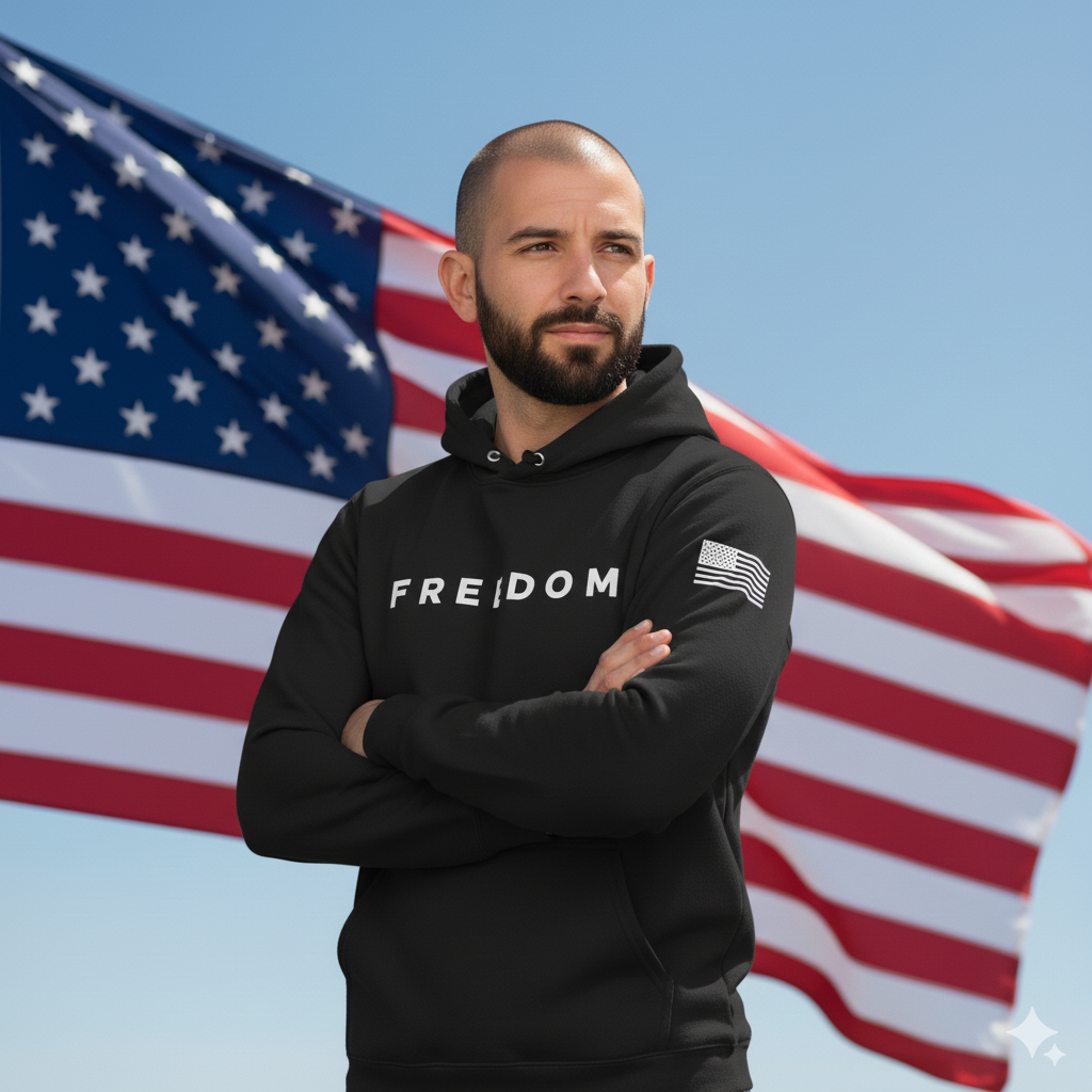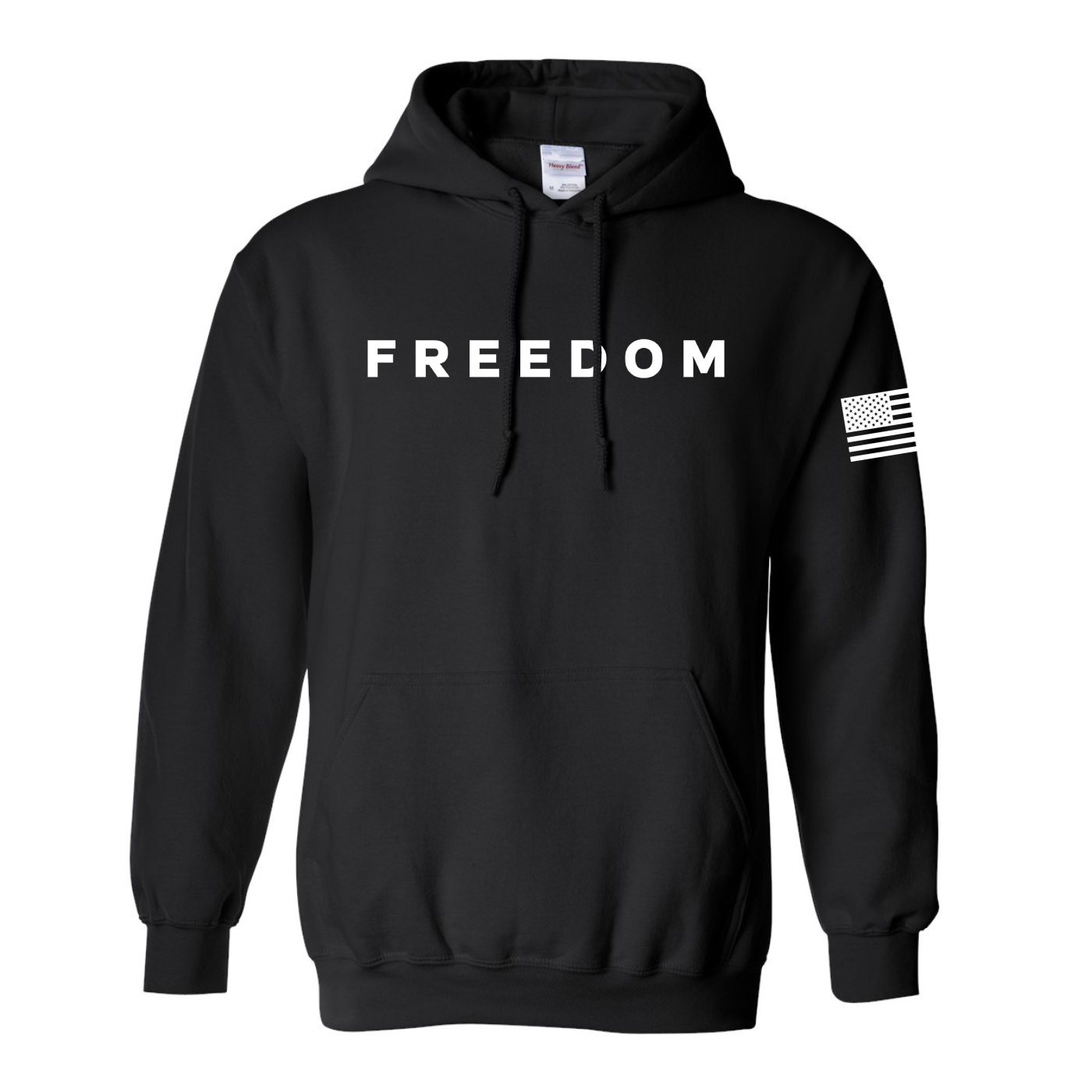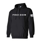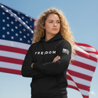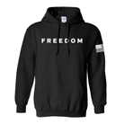 Wrap yourself in bold patriotism with the FREEDOM hoodie—a statement piece that blends comfort, conviction, and classic Americana. Crafted from premium heavyweight fabric, this black pullover features the word “FREEDOM” emblazoned across the chest in crisp, white block letters, making your stance unmistakable. The right sleeve showcases a stylized American flag graphic, adding a powerful touch of national pride. With a roomy front pocket and adjustable drawstrings, this hoodie is built for everyday wear, whether you're rallying, relaxing, or making your voice heard. It’s more than apparel—it’s a declaration.