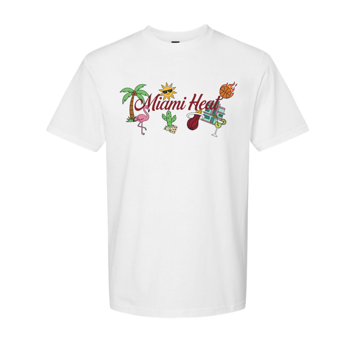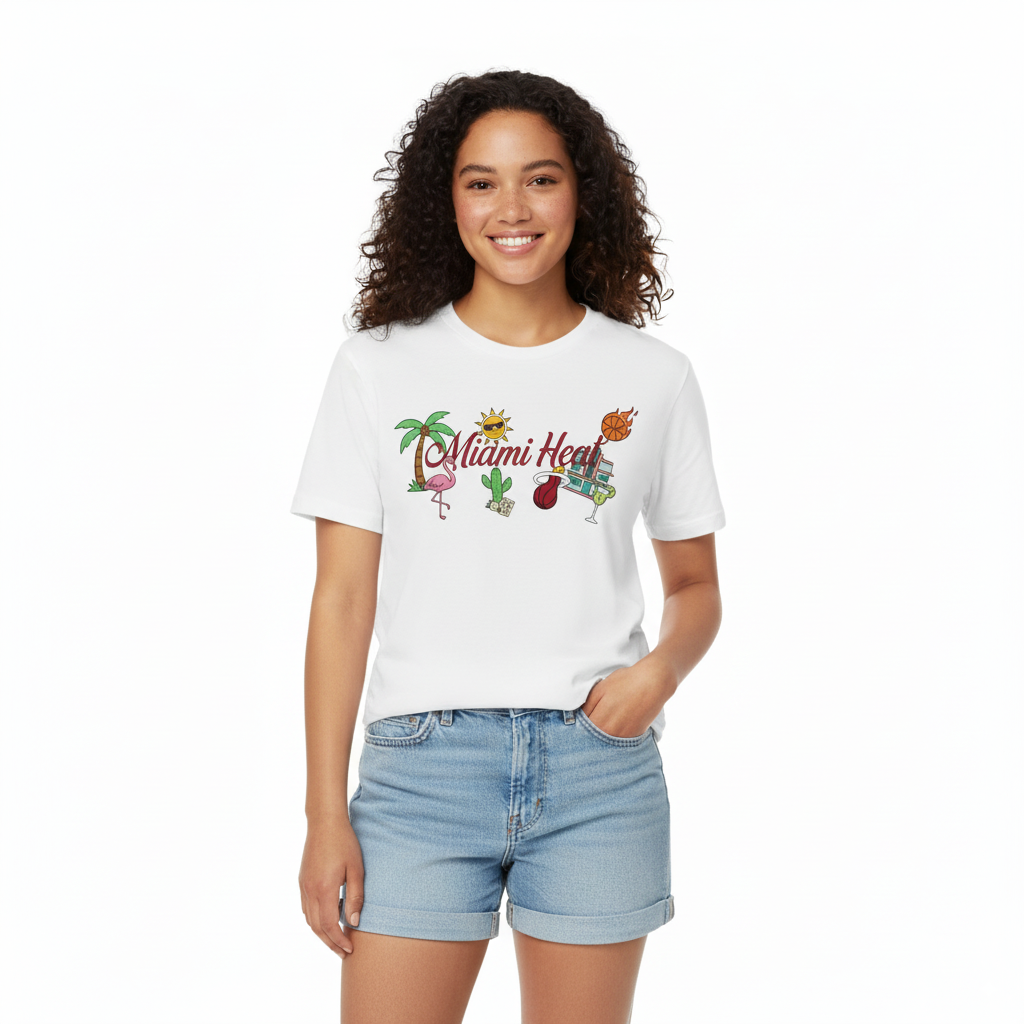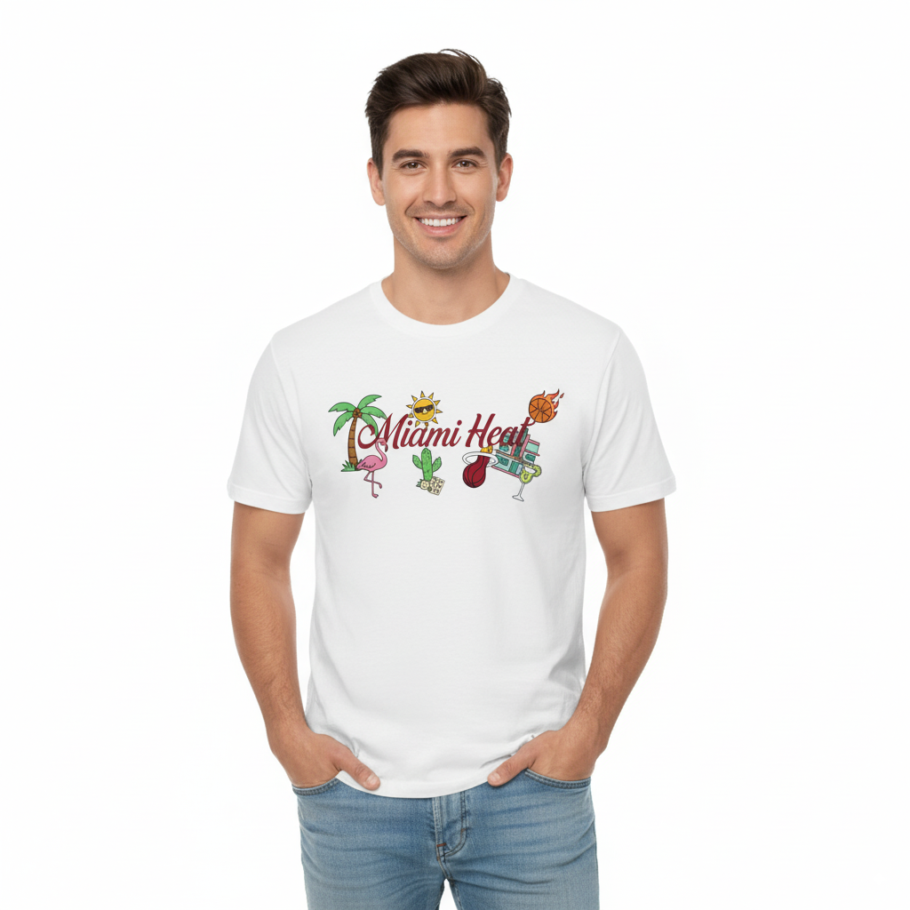 Turn up the tropical heat with this vibrant white T-shirt that celebrates Miami’s electric energy and playful spirit. The design features the bold “Miami Heat” text in a stylized red font, surrounded by a lively collage of illustrated icons—a flaming basketball, palm tree, flamingo, sun with shades, cactus, cocktail glass, and dollar bill—all bursting with color and personality. This graphic mashup captures the essence of Miami’s sun-soaked lifestyle, blending sports culture with beach vibes and a touch of cheeky fun. Perfect for fans of the Miami Heat or anyone who loves expressive, summer-ready streetwear, this tee is a visual party that turns heads and sparks smiles. Lightweight, eye-catching, and full of attitude, it’s your go-to for making a statement wherever the heat takes you.