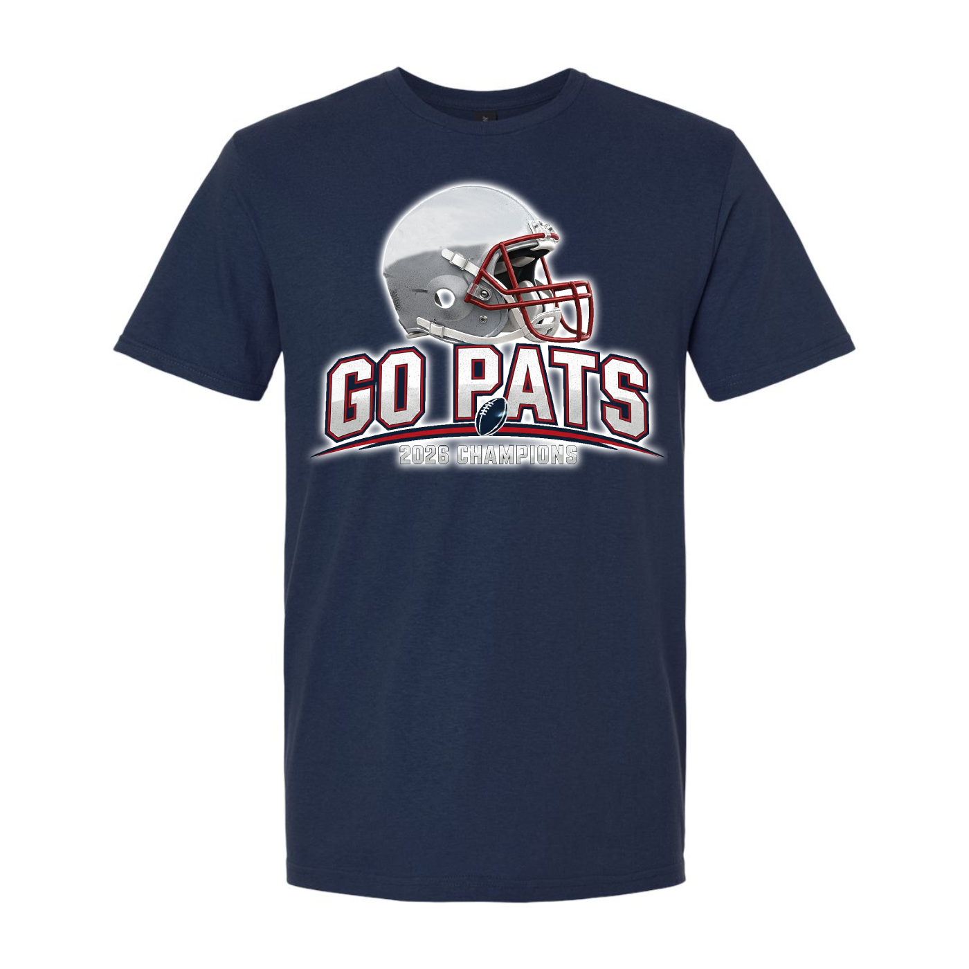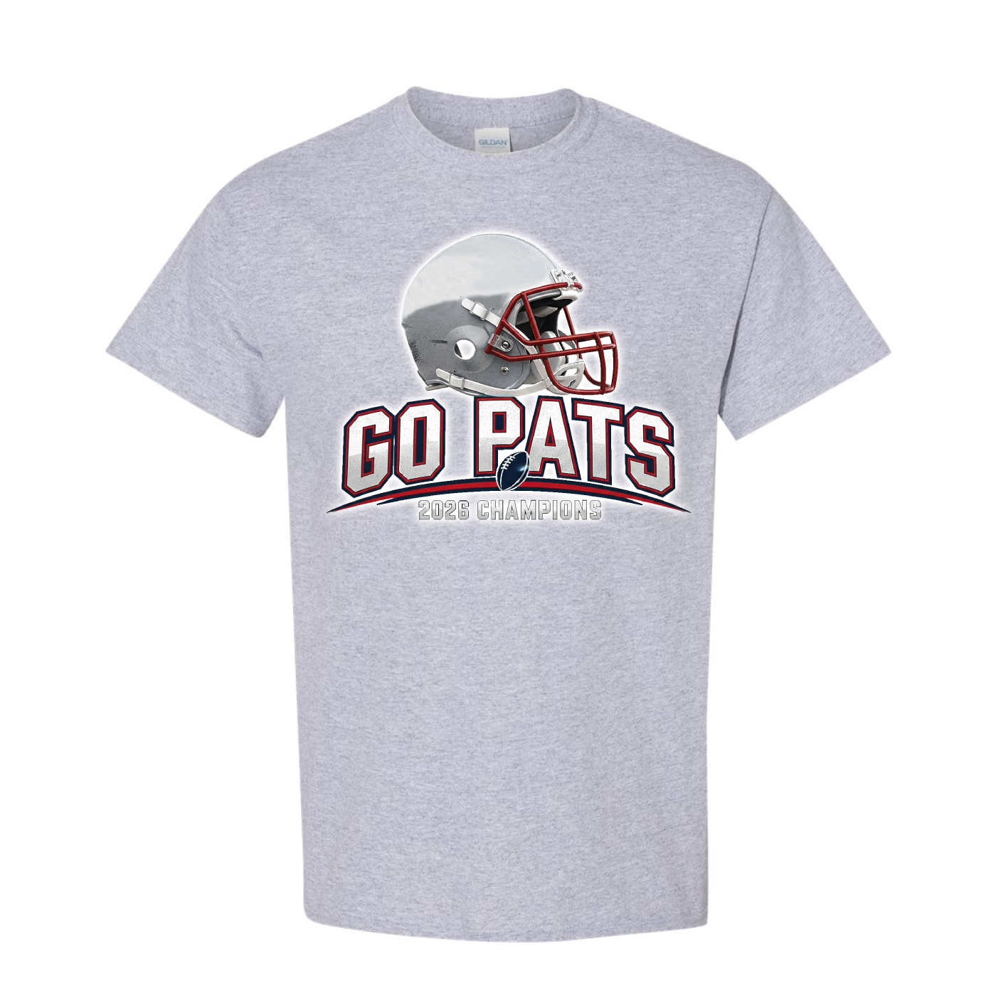 Show your championship pride with this electrifying "GO PATS – 2026 CHAMPIONS" tee, designed for fans who bleed red, silver, and blue. The navy blue shirt features a bold graphic of a silver football helmet with a fierce red facemask, capturing the intensity and legacy of gridiron greatness. Just below, the phrase "GO PATS" commands attention in powerful block lettering, flanked by a classic football icon and the victorious declaration "2026 CHAMPIONS." Whether you're celebrating the win or rallying for the next season, this shirt delivers unmatched fan energy and timeless style. Ideal for game days, sports bars, or everyday wear—this is more than a shirt, it’s a badge of honor. 100% COTTON
